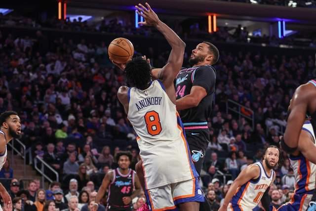 北京时间12月21日,NBA常规赛继续进行,尼克斯队主场迎战热火队。本场比赛,热火队卷土重来,占据主动,但尼克斯队反应很快。此后,两队陷入拉锯战。三节战罢,尼克斯领先6分。末节,布伦森带队占据主动,关键时刻造成三分犯规杀死比赛。最终,尼克斯队以132-125击败热火队,继续占据东部第二的位置。本场比赛,热火率先进入状态,打出10-0的进攻。尼克斯进入节奏,慢慢进入节奏,在第二节发起进攻。随着布伦森压哨三分命中,半场结束时他们领先4分。下半场鲍威尔爆发,但尼克斯不断回应并保持优势。决胜局双方陷入拉锯战之三。热火一度逼近,但布里奇斯三分命中,布伦森造三分犯规杀死比赛。尼克斯队开局依然轰轰烈烈,合计拿下104分,完全势不可挡。尽管替补球员没有提供太大帮助,但他们还是成功拿下了比赛。布伦森这一次状态火爆。他出战38分钟,26投15中,三分球13中6,罚球11中11,得到47分8助攻,没有失误,正负值+10。他在关键时刻站出来得分,帮助球队顶住了热火队的反击。除了布伦森之外,布里奇斯本场手感火热,三分球7中6拿下24分,弥补了唐斯5中1仅得到2分的颓势。此外,阿努诺比得到18分,哈特得到13分10篮板5助攻。击败热火队后,尼克斯队稳居东部第二,目前战绩20胜8负,三场比赛领先第三名凯尔特人队。热火队这次表现不错,可惜还是没能赢得比赛。新星威尔也表现出色。全场15投11中,三分球7投5中。他拿下职业生涯最高的28分和19个篮板。他成为热火历史上第一位贡献至少25分、15个篮板并命中5个三分球的球员。此外,鲍威尔也有22分,可惜最后一节未能做出任何贡献;哈斯克队替补拿下23分5助攻,阿德巴约只得到14分9篮板。
